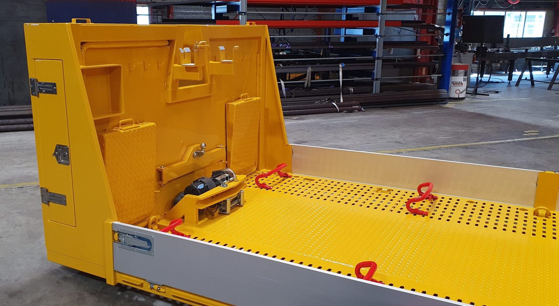 Mollen Container BV bouwt een Autoberging plateau container geschikt voor voertuig of machinetransport. Flexibiliteit in inzet: Het autoberging plateau van Mollen container heeft een zeer